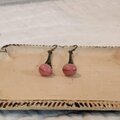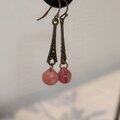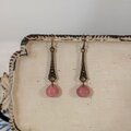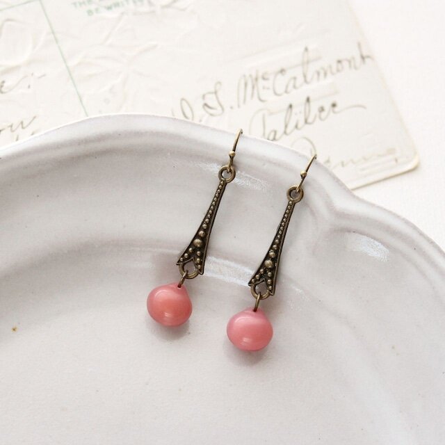 ちょっと渋めのアンティークテイストなパーツに、くすみピンク・マロンのような形のビーズを揺らせた、ビター&スウィートなピアスです。