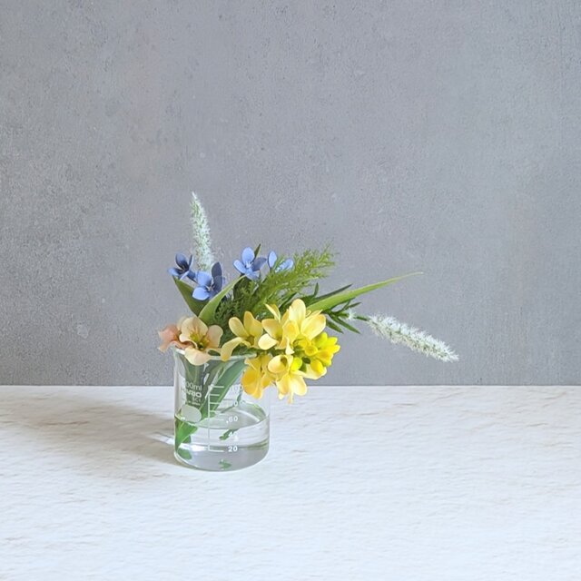 ビーカーに咲く、春色〔イエローヒヤシンス〕花のインテリア