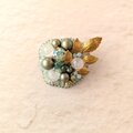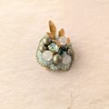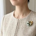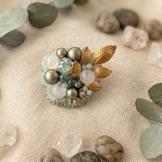 爽やかなミントグリーンのクリスタルガラスや表情豊かなアクリル、チェコガラス、そしてアンティーク調のメタルリーフを組み合わせ、瑞々しい印象のブローチに仕上げました。