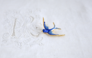 鮮やかなブルーのエナメルが目を引くツバメのブローチです。