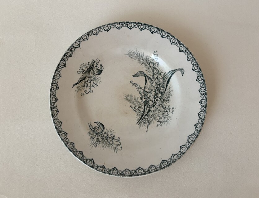 やわらかな古手の雰囲気が漂う、サンタマン「MUGUET(すずらん)」シリーズのスーププレートです。
