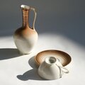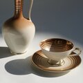 ドイツの磁器メーカーMitterteich Bavaria (ミッターテイヒ・バヴァリア)によって作られたヴィンテージのモカカップ&ソーサーとミルクジャグのセット。やわらかなアイボリーの磁器に、銅色のグラデーションと繊細なゴールドラインが重なる、ミッドセンチュリーらしい上品なデザインです。小さなモカカップは、エスプレッソやデミタスコーヒーに。ミルクジャグは、一輪の花を飾る小さなフラワーベースとしてお使いいただくのがおすすめです。希少な良好コンディションでのお揃いのセットです。