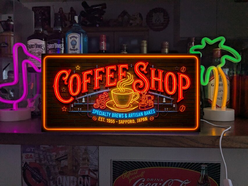 ネオンサイン風の卓上ライトで、コーヒーショップの雰囲気を演出します。
