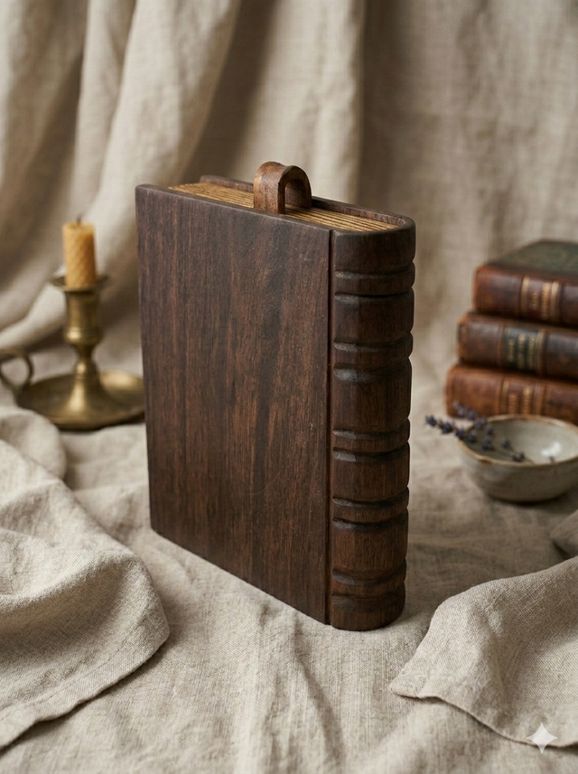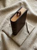 表紙(本体)には、一点物の家具にも使われる重厚なウォールナット無垢材を、そして重なり合う「本の紙」の表現には、明るい色調のタモ材を使用しました。異素材を組み合わせることで、本物のアンティーク本のような奥行きのある表情を生み出しています。