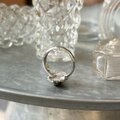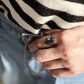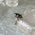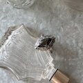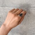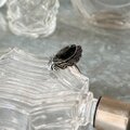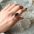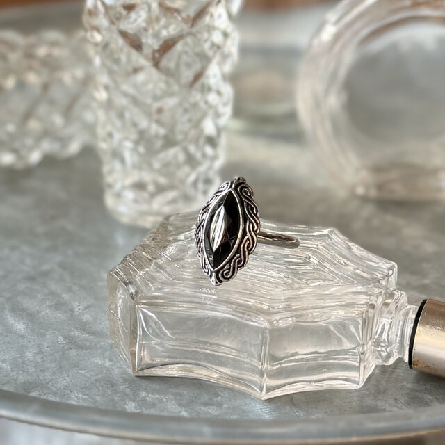 マーキスカットされたブラックグラスがセットされたシルバートーンリング。