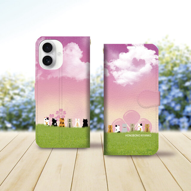 iPhoneケース iPhoneカバー スマホケース 手帳型スマホケース 緑 草原 ピンク 雲 ハート 恋 空 猫 白猫 三毛猫 黒猫