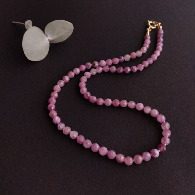 透明感や色合いが一粒一粒異なる『ピンクトルマリンシリカ』をグラデーションの様に組み合わせて、シンプルなチョーカーネックレスに仕上げました。カッティングされた粒は室内でも上品に輝いて美しいですよ♪