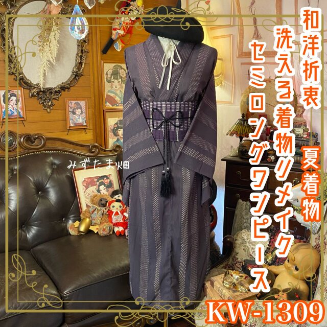 【 夏着物リメイク セミロングワンピース/ドレス/洗える化繊 帯サッシュベルト パープル×焦茶の粒子 KW-1309】