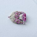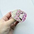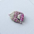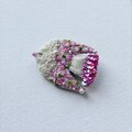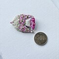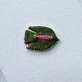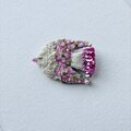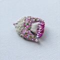 しっぽの部分は、濃いピンク色のちいさなスパンコールを重ね、ブローチに光が当たった時にもきれいに輝くように使いました。尻尾の端には、同じ色合いのガラスビーズもつけてあります。