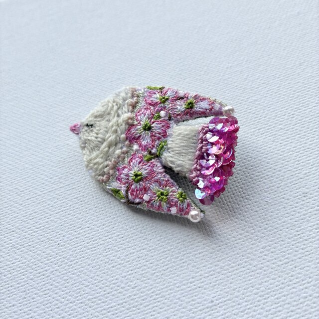 "hanamizuki" ピンク色の華やかなハナミズキの花を纏う鳥さん/手紡ぎ糸を使った手刺繍/鳥ブローチ