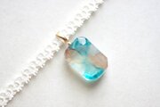滲んだような緑とブラウン、横切るゴールドのラインが華やかで存在感のあるレジンを、サテンリボンにタティングレースで装飾を施したチョーカーに仕上げました。
