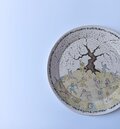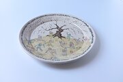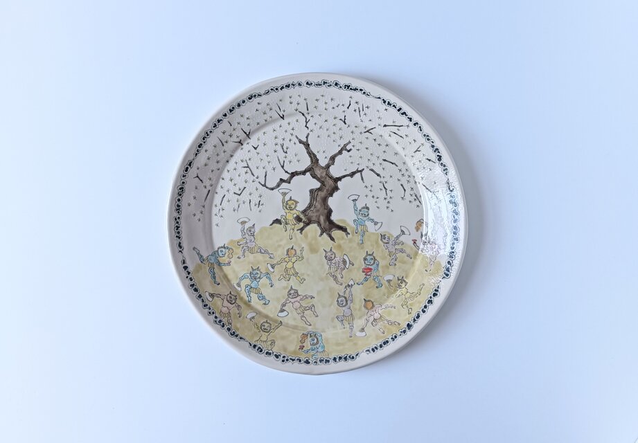 花見の鬼デザインの皿。めでたいことはなんもないけど、そんなときに心象風景の鬼たちを描く。花見の宴で賑やかに騒ぐたくさんの鬼たち。