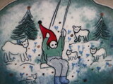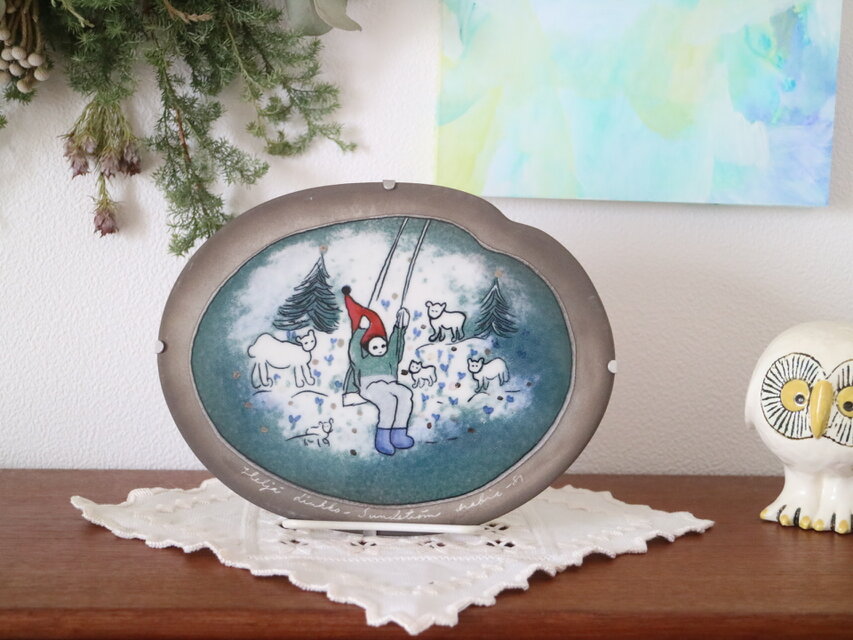 ARABIA社製Heljä Liukko-Sundström(ヘルヤ・リウッコ=スンドストロム)による陶板作品です。タイトルは 「Keinuva tonttu(ブランコに乗るトントゥ)」。