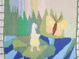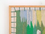 森の中に立つ少女と、大きな蝶。北欧らしいやさしい色合いで、自然の静かな風景が織りで表現されています。
