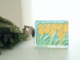 ガラスいっぱいに咲く、可愛らしいチューリップ。見ているだけで、春の明るい空気を運んできてくれるような作品です。