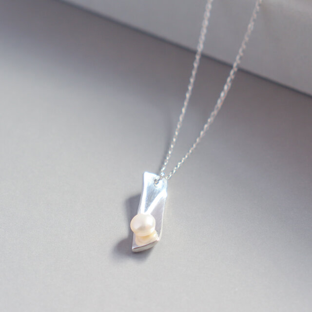 有機的なフォルムのシルバープレートに、約5mmの淡水パールをあしらったネックレスです。