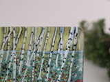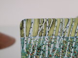 白樺の森の中で、色づいた葉が風に舞う様子が描かれた一枚。フィンランドの秋の静かな森を思わせる、やさしく美しい情景です。