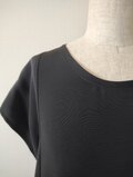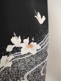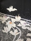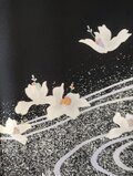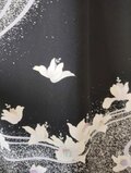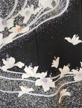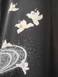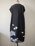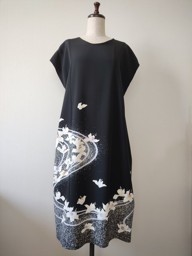 梔子の花でしょうか、流れるような曲線と共に蝶のように舞う白い花が黒地に映えて上品な美しさがある留袖から創ったワンピースとなります。フレンチスリーブのさり気ないデザインは幅広く活躍できる一着、あったら重宝すること間違いなしのお勧めの一品です。