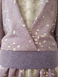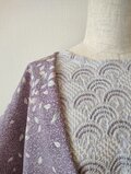 波型模様の絞り染めの羽織り生地と偶然にも色がよく合った小さな葉が舞う着物生地とを組み合わせたセットアップ、ツーピースとなります。
