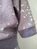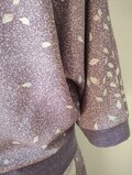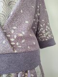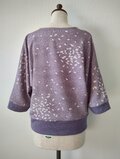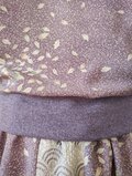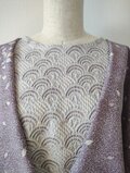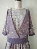 二着の重ね着のように見えるトップスですが一枚に縫い合わさり、袖口と胴回りに付けた藤紫のニットのリブもたまたま家にあった物なのに色が良く合い、着やすくアクセントにもなっています。