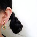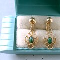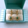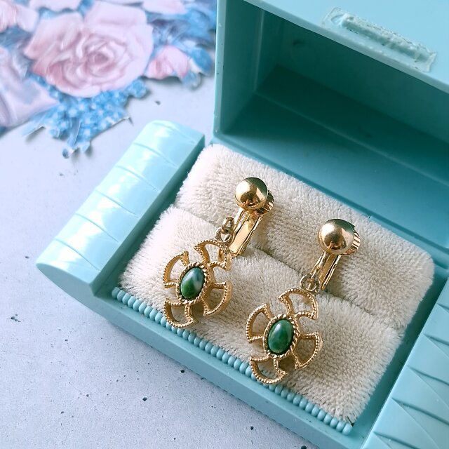 1886年アメリカのニューヨークにて小さな香水会社を創業、1971年に本格的にコスチュームジュエリーの製作を開始したAvon(エイボン)の1973年に販売された“Baroness”のジェイドを模したカボションがあしらわれたマルタクロスが揺れるデザインのヴィンテージイヤリングです。