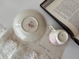 このカップの何よりの特徴は、サルグミンヌらしいこだわりのある持ち手のデザイン。小さな器の中に、職人の美意識がぎゅっと詰め込まれています。お揃いのソーサーは立ち上がりが高く、ころんとした愛らしいフォルム。中央に描かれた水仙の花と、長い年月が育んだ柔らかな色付きが、なんとも言えない趣を添えてくれます。