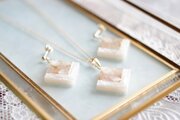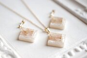 透明のレジンにホワイトシェルとローズクォーツのさざれを沈め、光沢のあるホワイトで囲ったピアス。