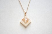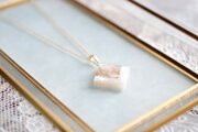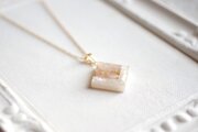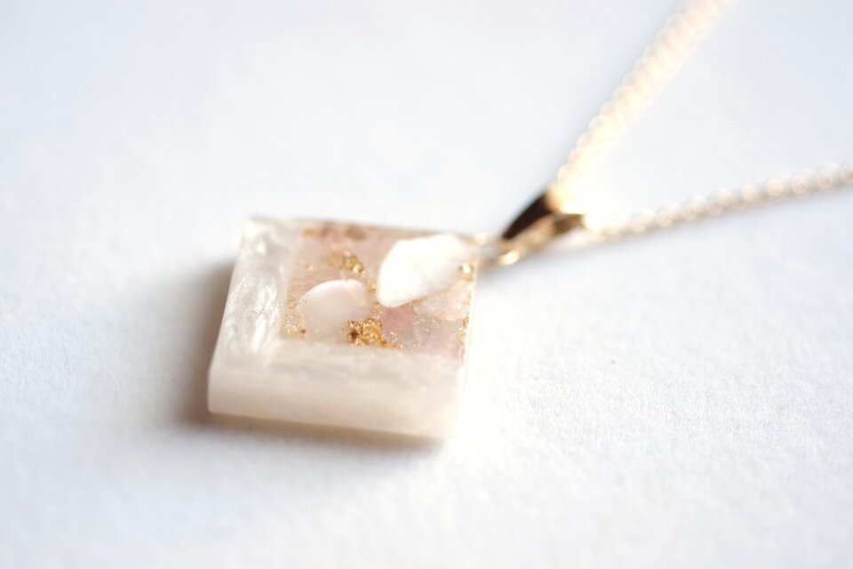 透明のレジンにホワイトシェルとローズクォーツのさざれを沈め、光沢のあるホワイトで囲ったペンダント。
