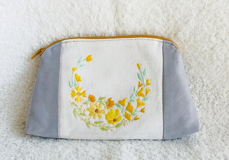 白の刺繍用布地にお花の刺繍を施した、台形ポーチです。