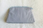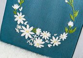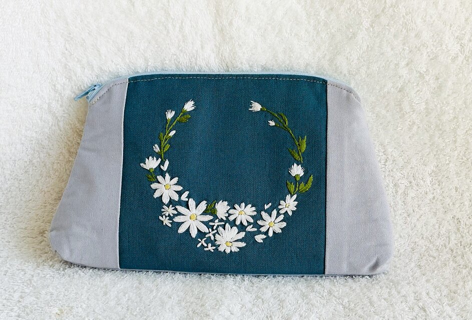 濃い青の刺繍用布地にお花の刺繍を施した、台形ポーチです。
