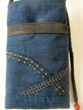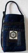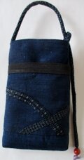 中綿を入れ、男絣で作ったループっを付け、片側のループの輪っかの中を通して結んで下げるようにしています。