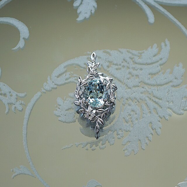 オーバルアクアマリンを使用し、シルバーでボタニカル調のペンダントを製作いたしました。