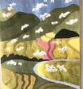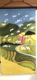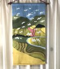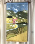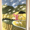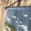 麻100%生地に、ロウケツ染の技法を使って、タペストリーを染めました。まるで砂漠の中のオアシスのような春の田園地帯を描きました。 洋室の壁にも、床の間にもマッチします。新しいインテリアのアクセントに、いかがでしょうか?