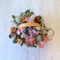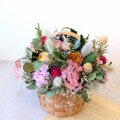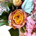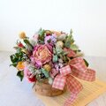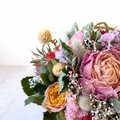 こちらのアレンジは、ドライフラワーを使い制作しています。ドライフラワーは、非常にデリケートな素材です。お取り扱いは優しく丁寧にお願い致します。ドライフラワーは、概ね半年程で退色が始まります。早い物では1~2カ月で退色する花材もあります。これも自然の移ろいとご理解頂き、時間の経過と共にアンティーク調に変化していくその経過もお楽しみ頂ければ嬉しいです。アンティーク調に変化したドライフラワーも、趣があり素敵な物です。