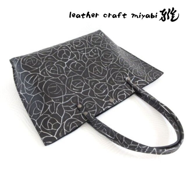 〇ローズ調の型押しが施されたカチッとハリのあるレザーです。