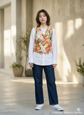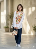 色鮮やかな着物のテキスタイルが、シンプルなシャツやデニムスタイルに上品な華やかさをプラスします。