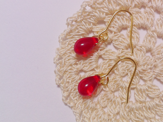 ルビー色のチェコビーズのしずくがちいさく揺れるピアスです。