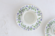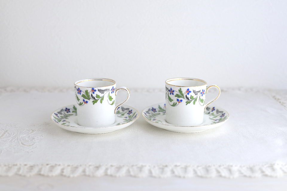 白磁に、可憐なブルーの小花と繊細なシダが描かれた、気品あふれるデザインです。カップの内側や縁、ハンドルには金彩が施されていますが、経年によるハゲがあります。古いものの味わいとしてご覧いただけると嬉しいです。ヒビ、カケなどはありません。