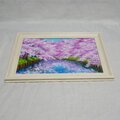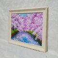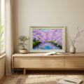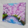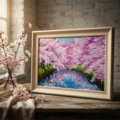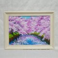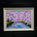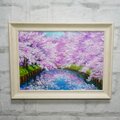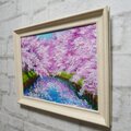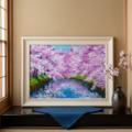 特に注目すべきは、川面に映り込む美しいピンクの影と青空のコントラストです。この幻想的な水面の描写が、春の爽やかな風を感じさせ、見る人の心に穏やかな波を立てます。厚塗りの油彩技法によって生み出された立体感は、光の角度によって異なる表情を見せ、印刷物では味わえない贅沢な質感をお楽しみいただけます。