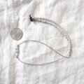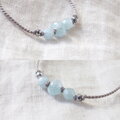 ほんのり透明感のある淡いライトブルーのアクアマリンにキラリと輝くシルバー色のヘマタイトを添えて、グレー色のシルクコードで繋いだ爽やかな雰囲気のショートネックレスです。