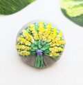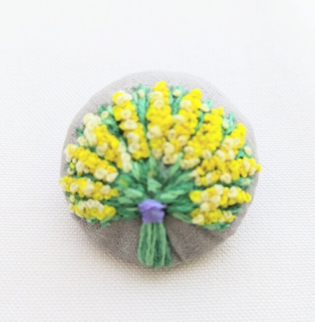 グレーブラウン色の綿リネン生地に明るく可愛いミモザの花の花束をモチーフにした刺繍ブローチです。