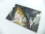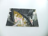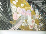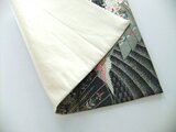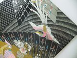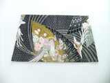 ■新品の帯をリメイクしました。扇面に飛ぶ鳳凰と小花の文様です。黒地に銀糸が織り込まれ光沢があり高級感がございます。