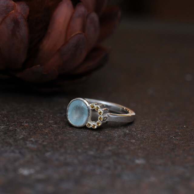 『ブルーサファイアの三日月環リング』などではカナリーイエローサファイアを使いましたが、こちらはゴールデンイエローサファイアを使ってます。ライトブルーとイエローで調和のカラーなんですが、ちょっとぶつかる要素も欲しかったという感じでゴールデンイエローをチョイス。力強さも感じて頂けるカラーリングにしております。