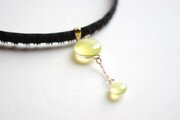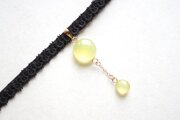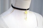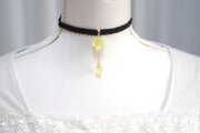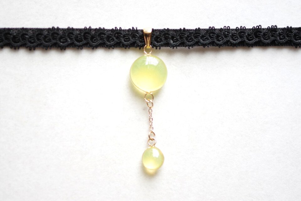 ぷっくり張りつめた大小の水滴のような透明感に魅入ってしまうレジンを、ベルベットリボンにタティングレースで装飾を施したチョーカーに仕上げました。