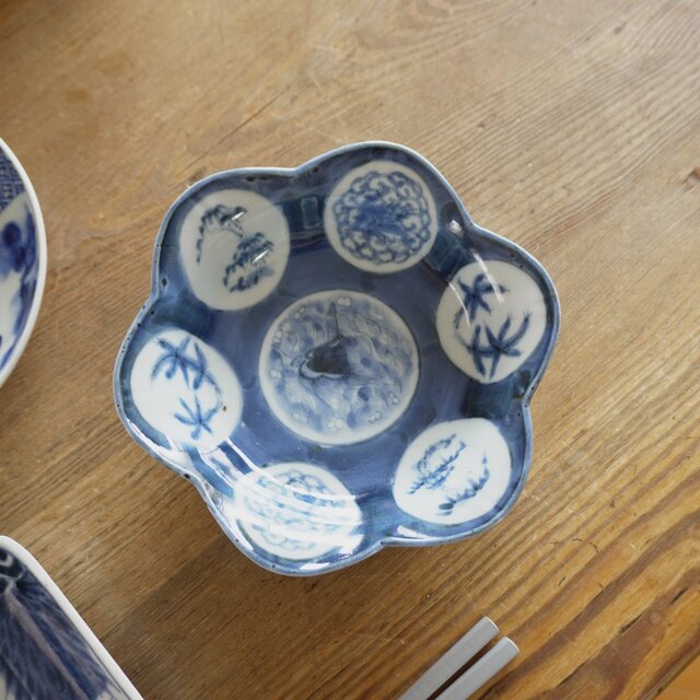 細部まで丁寧に染められた江戸時代の呉須を使った絵付けは、どこか遊び心もあり、祝いの席にもぴったり。少し深さもあるので汁気のある料理にも。