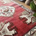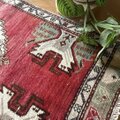周りに入ったやさしいベージュやグリーンの色味も絶妙で、全体に温かみのある雰囲気。ナチュラルな床や木の家具、観葉植物とも相性がよく、敷くだけで空間がぐっとおしゃれな雰囲気にまとまります。ヴィンテージラグ特有の素朴な柄も魅力で、見れば見るほど味わいを感じられるデザインです。