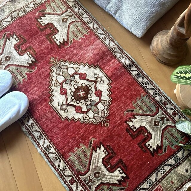 気軽にヴィンテージラグの魅力を取り入れたい方にもおすすめの、可愛らしく雰囲気のある一枚です。