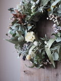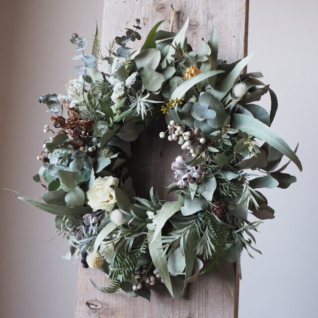 それぞれの葉の個性を活かし、まるでリースそのものが生命を持って芽吹いたかのように、生き生きとした躍動感を込めて紡ぎました。
