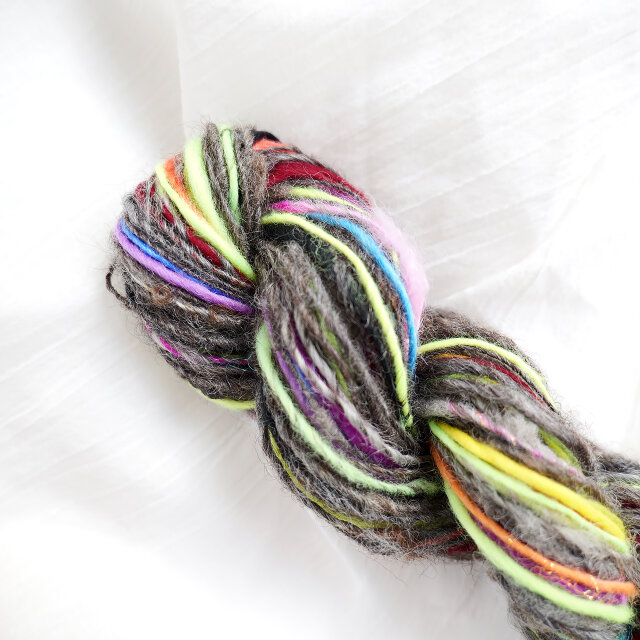 蛍光色のメリノウールやポロワスなどをカラーブレンドして紡ぎました。
