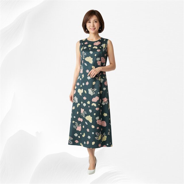 ノースリーブのすっきりとしたデザインは、一枚でさらりと着こなすのはもちろん、カーディガンやジャケットさを羽織ることで季節を問わずお楽しみいただけます。お食事会や美術館巡り、ちょっとしたお出かけなど、特別な一日を華やかに彩る一着としていかがでしょうか。
